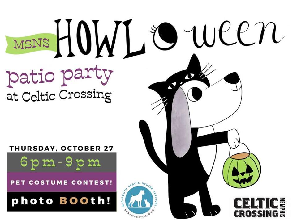 Join us at our 2nd Annual Howl-o-ween Patio Party at Celtic Crossing benefitting Mid-South Spay & Neuter Services on Thursday, October 27 from 6:00-9:00pm. We will have a pet costume contest with fabulous prizes and a photo booth for you to save the memories! Featuring Tito’s Vodka, who will have a signature cocktail with 100% of the proceeds benefiting MSNS.